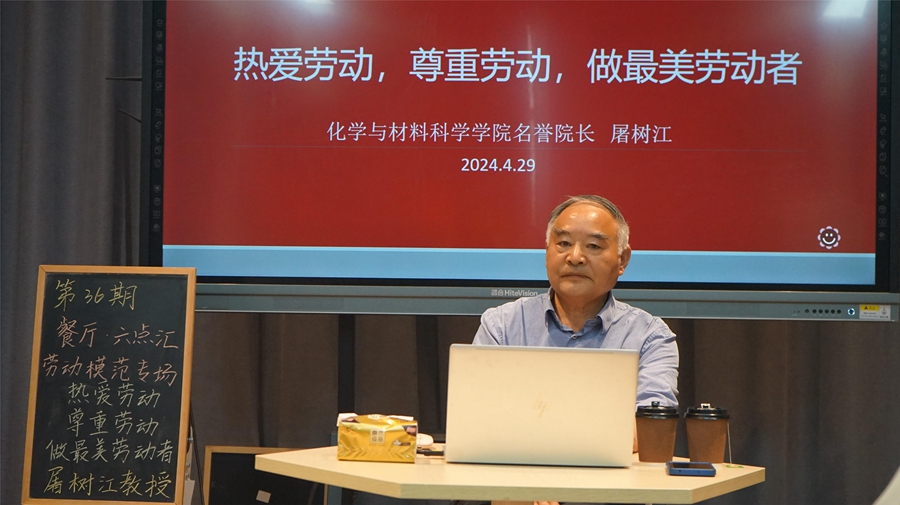4月29日下午,第36期“餐廳·六點(diǎn)匯”勞動(dòng)模范專場活動(dòng)在泉山校區(qū)“餐廳·六點(diǎn)匯”實(shí)踐基地舉行。化學(xué)與材料科學(xué)學(xué)院名譽(yù)院長、全國五一勞動(dòng)獎(jiǎng)?wù)芦@得者屠樹江教授就“熱愛勞動(dòng),尊重勞動(dòng),做最美勞動(dòng)者”這一主題與同學(xué)們進(jìn)行交流。