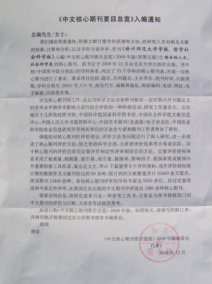 根據《中文核心期刊要目總覽》2008年版編委會通知,《徐州師范大學學報》(哲學社會科學版)已入編《中文核心期刊要目總覽》2008年版(即第五版)之綜合性人文、社會科學類核心期刊。特向全校領導和師生報喜! 科技處、社會科學處 徐州師范大學學報學報編輯部(哲學社會科學版) 二〇〇八年十二月三十日