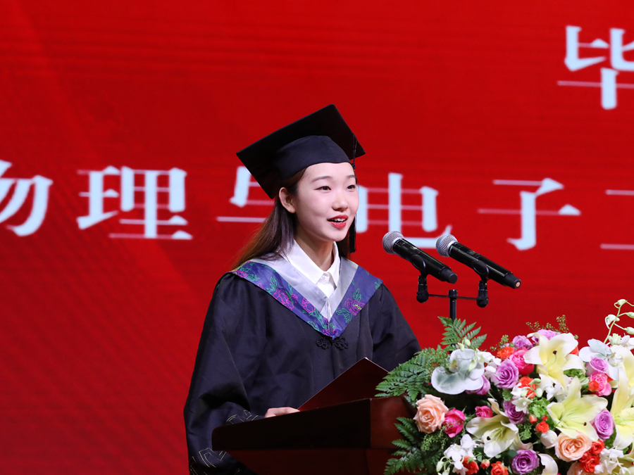 省三好學(xué)生、省優(yōu)秀共青團(tuán)員、省優(yōu)秀畢業(yè)生、2023年度“蘇師榜樣”獲得者 物理與電子工程學(xué)院任一冉同學(xué)作為畢業(yè)學(xué)生代表發(fā)言。她帶領(lǐng)同學(xué)們一起深情回顧了大學(xué)生活的點滴,表達(dá)了對同窗、對師長、對母校的感恩與眷戀,同時也勉勵同學(xué)們云程發(fā)軔、揚鞭策馬,以昂揚的師大精神,熱情奔赴下一場山海。