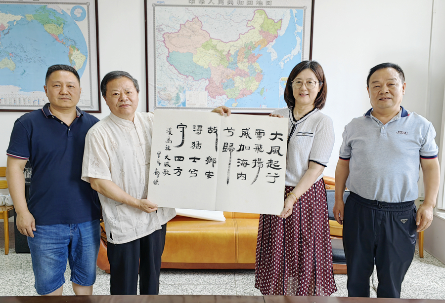 捐贈儀式前,郭謙先生一行和圖書館負責同志以及館員代表舉行了簡短座談會,會上,圖書館負責同志詳細介紹了圖書館的發(fā)展歷程與現(xiàn)狀,并邀請郭謙先生現(xiàn)場創(chuàng)作書法作品。郭謙先生欣然應(yīng)允,揮毫潑墨,書寫《大風歌》書法作品贈送圖書館。