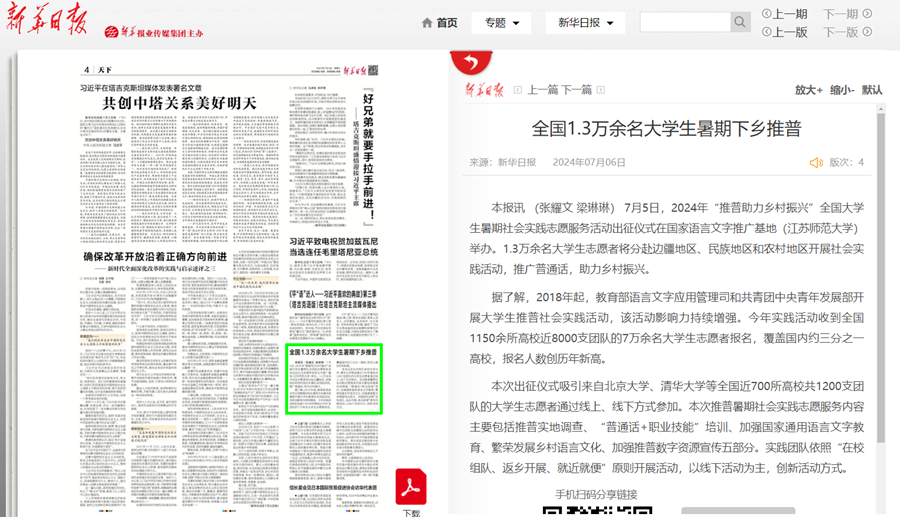 新華日報7月6日報道在我校舉辦的2024年“推普助力鄉(xiāng)村振興”全國大學(xué)生暑期社會實踐志愿服務(wù)活動出征儀式,報道內(nèi)容如下: