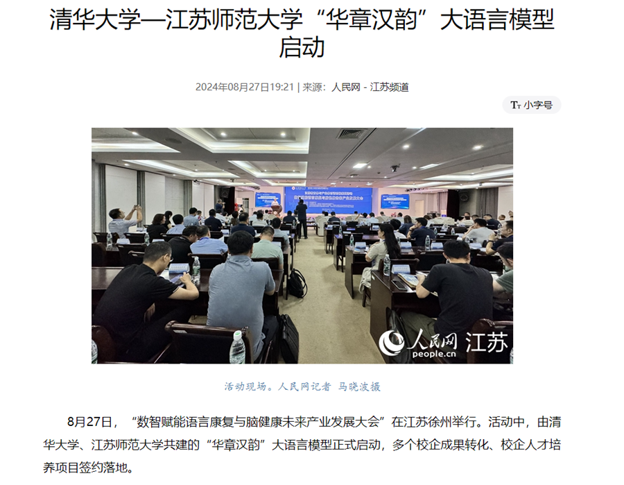 8月27日,“數(shù)智賦能語(yǔ)言康復(fù)與腦健康未來(lái)產(chǎn)業(yè)發(fā)展大會(huì)”在江蘇徐州舉行?;顒?dòng)中,由清華大學(xué)、江蘇師范大學(xué)共建的“華章漢韻”大語(yǔ)言模型正式啟動(dòng),多個(gè)校企成果轉(zhuǎn)化、校企人才培養(yǎng)項(xiàng)目簽約落地。