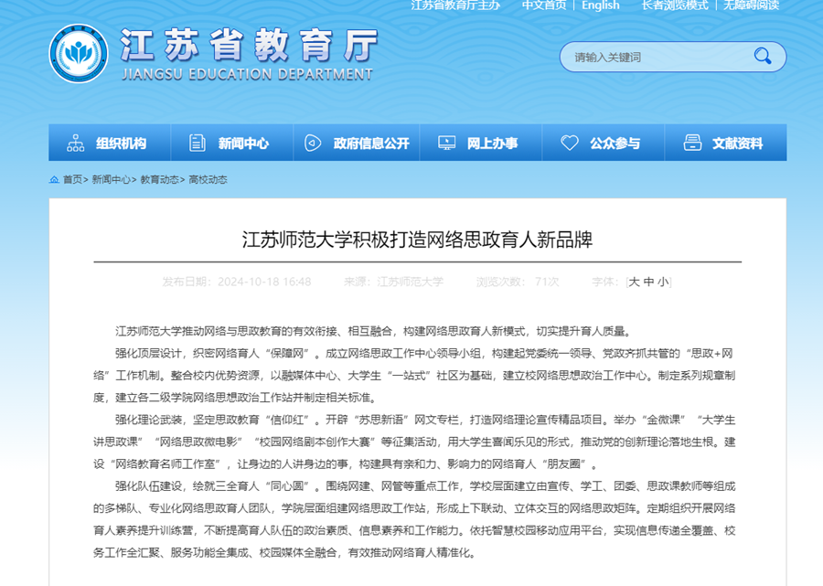 江蘇省教育廳網(wǎng)站報(bào)道我校網(wǎng)絡(luò)思政育人工作經(jīng)驗(yàn),報(bào)道內(nèi)容如下: