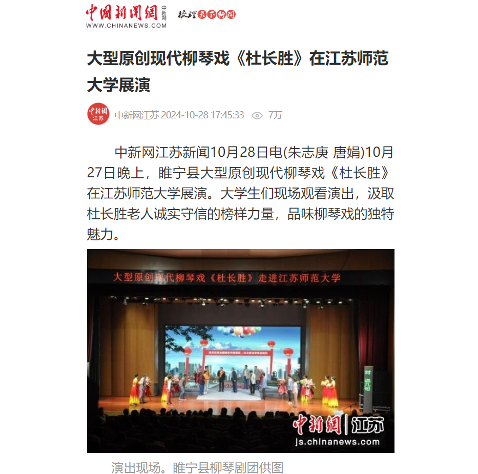 中國新聞網10月28日報道在我校演出的大型原創現代柳琴戲《杜長勝》,報道內容如下: