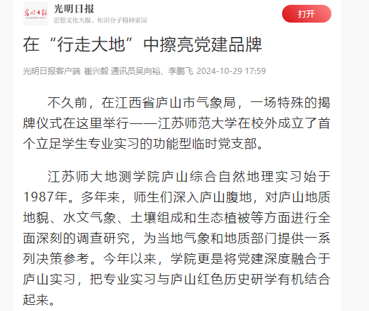 不久前,在江西省廬山市氣象局,一場特殊的揭牌儀式在這里舉行——江蘇師范大學(xué)在校外成立了首個(gè)立足學(xué)生專業(yè)實(shí)習(xí)的功能型臨時(shí)黨支部。