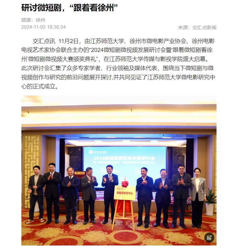新華日報交匯點新聞11月3日報道我校舉辦的“2024微短劇微視頻發(fā)展研討會暨‘跟著微短劇看徐州’微短劇微視頻大賽頒獎典禮”,報道內(nèi)容如下: