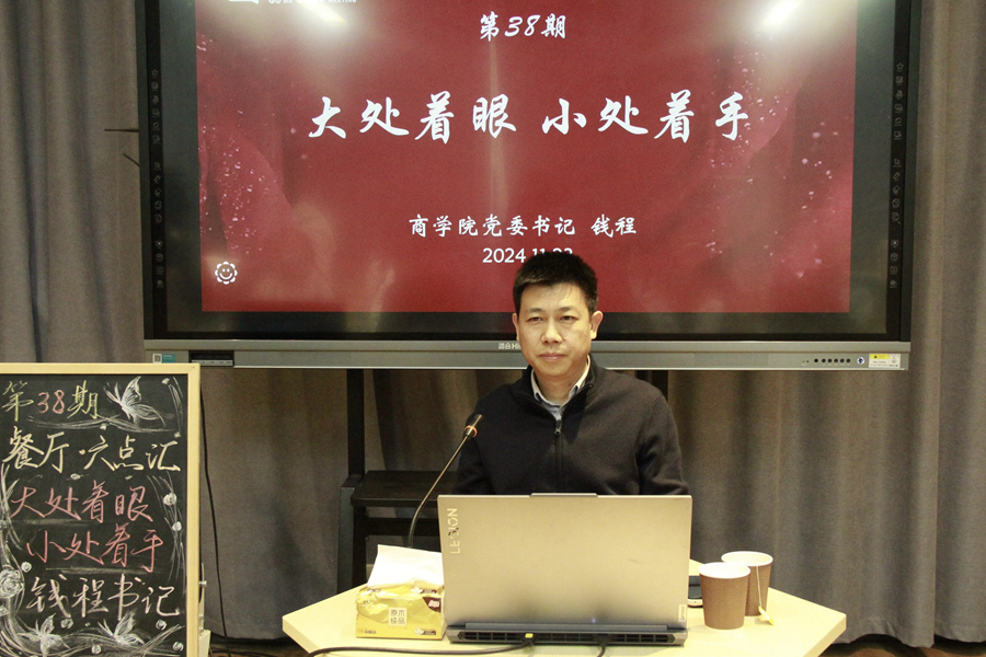 11月23日下午,第38期“餐廳·六點匯”活動在泉山校區(qū)“餐廳·六點匯”實踐基地舉行。商學院黨委書記錢程就“大處著眼,小處著手”這一主題與在場同學進行交流。