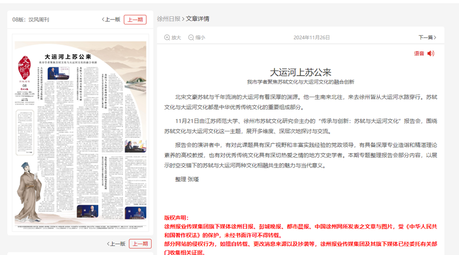 徐州日報11月26日第八版,整版報道在我校舉辦的蘇軾文化與大運河文化研討會,報道內容如下: