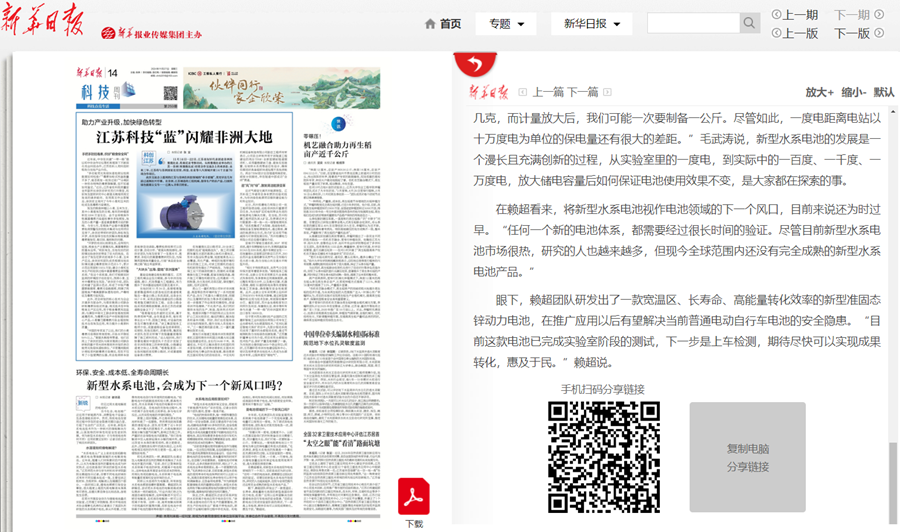 眼下,賴超團隊研發(fā)出了一款寬溫區(qū)、長壽命、高能量轉化效率的新型準固態(tài)鋅動力電池,在推廣應用以后有望解決當前普通電動自行車電池的安全隱患。“目前這款電池已完成實驗室階段的測試,下一步是上車檢測,期待盡快可以實現(xiàn)成果轉化,惠及于民。”賴超說。