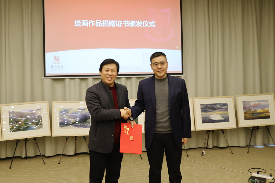 活動現(xiàn)場,美術(shù)學院甘興義教授滿懷對教育事業(yè)的深厚情懷與對校園文化建設的大力支持,無私捐贈出多幅精心創(chuàng)作的繪畫佳作,這些作品將在學生“一站式”社區(qū)陳列展示,不僅為社區(qū)空間注入了藝術(shù)活力,更為莘莘學子營造了濃郁的藝術(shù)氛圍,使他們能夠近距離感受繪畫藝術(shù)的獨特魅力,在潛移默化中提升審美素養(yǎng)。趙鵬代表學校向甘興義教授頒發(fā)捐贈證書,對他的善舉表示衷心感謝。