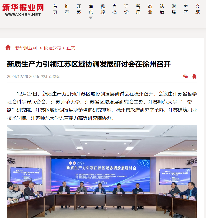 12月28日,新華報業網交匯點新聞報道在我校舉辦的新質生產力引領江蘇區域協調發展研討會,報道內容如下: